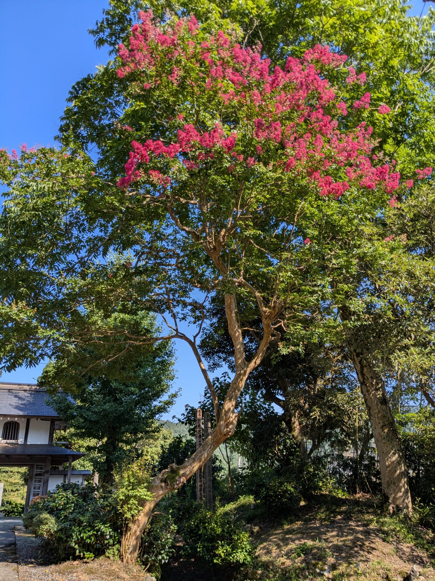 在原の百日紅は他よりも開花が遅く、この樹自体も一度は枯れてしまうかというほど弱っていたそうなので、写真のように一部しか花が咲きません。